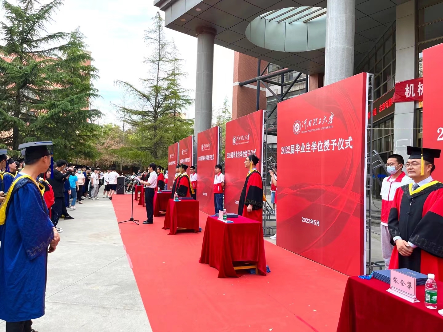 在院楼前广场搭台布景举办了2022届毕业生学位授予仪式,院党委书记聂凯、院长张新民、党委副书记许荣梅、副院长焦锋、明平美、张登攀出席了仪式,并为获得学士、硕士、博士学位的877位毕业生和在校留学生代表一一颁发了学位证。学院机关各科室工作人员同2022届毕业生一起参加了仪式。仪式由教科办主任魏绍亮主持。