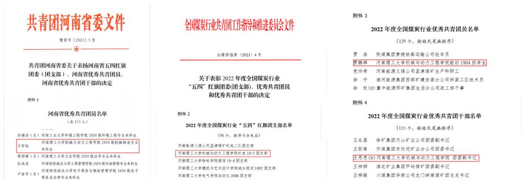 机制2003班王世钰被授予“河南省优秀共青团员”、机电19-2班团支部被授予“全国煤炭行业五四红旗团支部”、能动1904班贾鹏辉被授予“全国煤炭行业优秀共青团员”、院团委副书记王思思被授予“全国煤炭行业优秀共青团干部”,年度所获五四表彰数量创黑料正能量