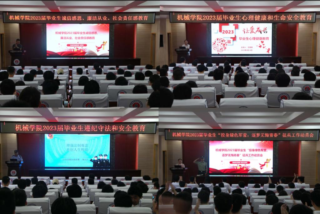 对全体学生进行“成长、成人、成才、成功”“四成教育”的最后一个环节,以遵纪守法、安全教育为基础,以爱国主义和理想信念教育为核心,以责任担当、诚信感恩、廉洁从业教育为重心,以阳光心态、健康理念为灵魂,以从军报国、致力国防事业为引领,着力培植学生爱国荣校意识和正确的民族观与国家观,为毕业生顺利毕业、走出校园、走上社会、走向成功打下了坚实的基础。