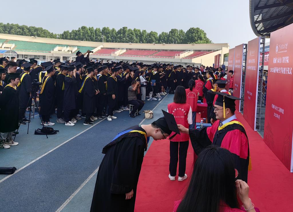 于新体育场搭台布景隆重举办了2023届本科毕业生学位授予仪式。学院原党委书记聂凯应邀参加了仪式,学院党委书记余本胜、党委副书记王帅、副院长焦锋、副院长张登攀出席了仪式,并为获得学士学位的800余位毕业生和在校留学生代表一一颁发了学位证。毕业班辅导员及2023届毕业生一同参加了仪式。
