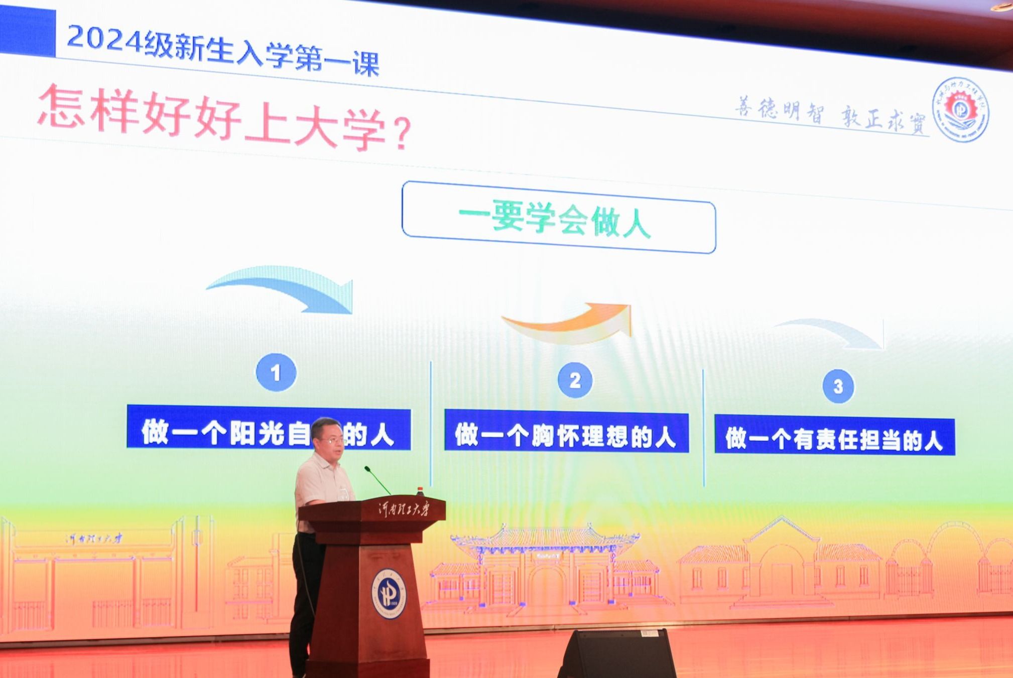 开学典礼在雄壮的国歌声中拉开了序幕。明平美为新生讲授“入学第一课”,其以“大学”为关键词,围绕什么是大学,为什么上大学,怎样好好上大学三个问题进行了详细介绍和阐述,从拓展知识的广度、锤炼意志的韧度、加大行动的力度、增强情感的厚度、提升境界的高度、提高成事的效度六个维度引导新生如何学会做事。对于即将开始的大学生活,明平美对同学们提出了四点希望:一是坚定理想信念,筑牢信仰之基;二是明确发展目标,把准成才方向;三是深化专业认识,提高综合能力;四是锤炼品德修为,磨炼意志品质。
