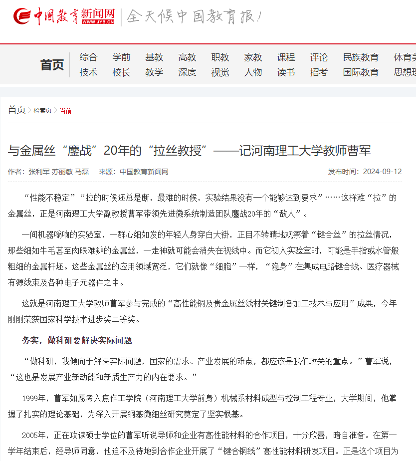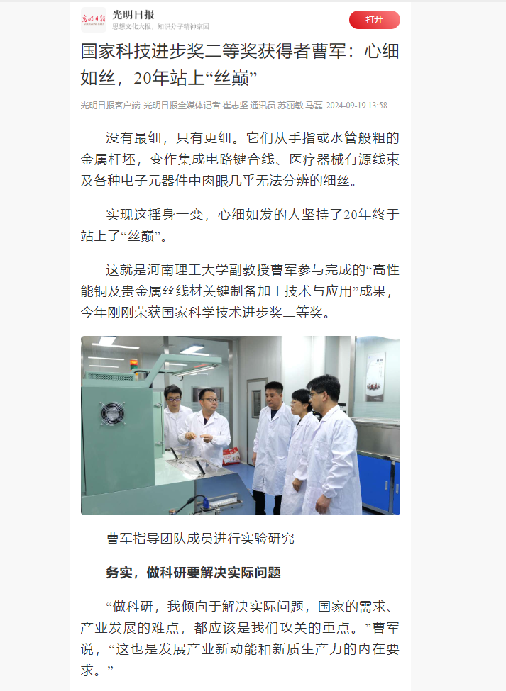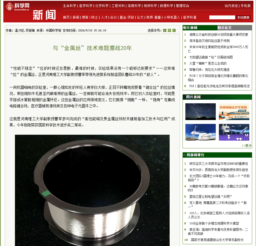 副教授曹军参与完成的“高性能铜及贵金属丝线材关键制备加工技术与应用”成果,今年刚刚荣获国家科学技术进步奖二等奖。