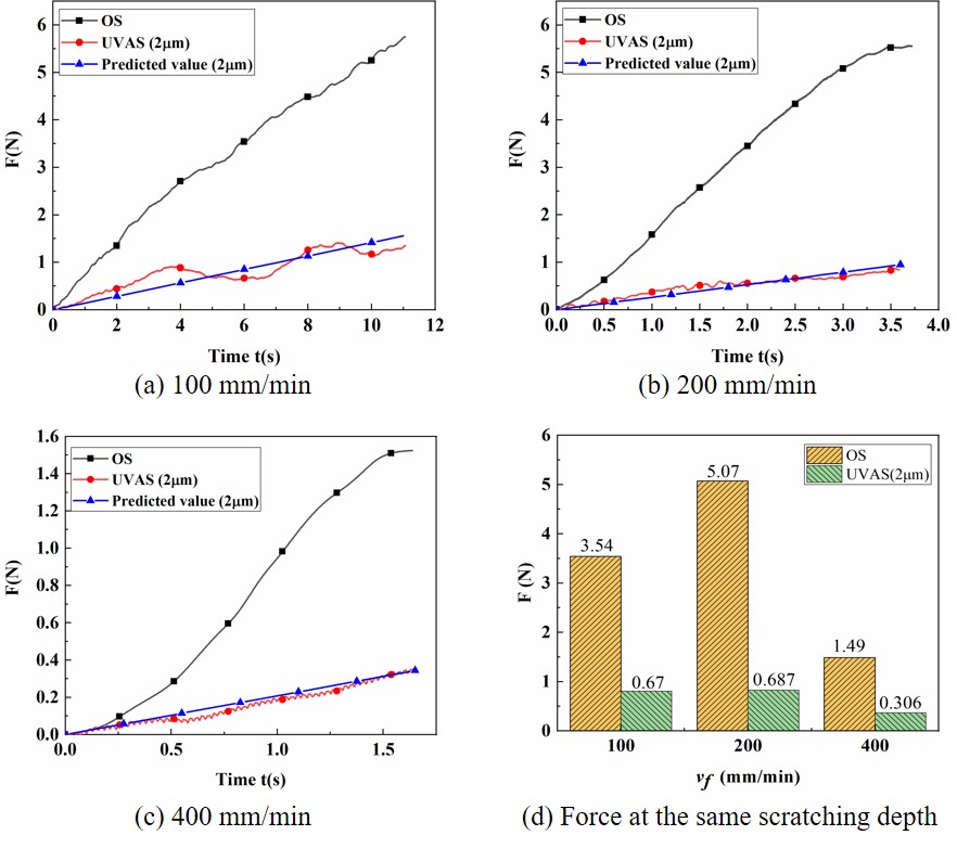 2)微去除加工可以看做工具在工件上的微观划刻作用,为探究SiCp/Al复合材料的微去除机理,向道辉教授团队基于材料特性和超声加工特性,将划刻力分为多个部分进行计算,提出了超声振动辅助划刻力模型,并自主搭建了超声振动辅助划刻装置,对多种体积分数的SiCp/Al复合材料进行了试验验证,该研究为复合材料的微去除加工提供了一定的理论指导。