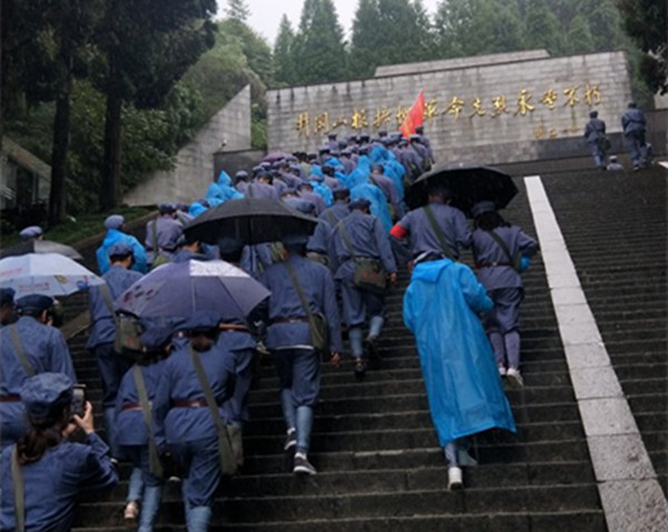 下午三时,队员们驱车赶往井冈山革命烈士陵园,参加祭奠“井冈英烈”仪式教学。细雨中的烈士陵园显得格外庄严肃穆,挺拔的参天松柏像是严阵以待的红军战士,紧紧环绕烈士陵园,守护着每一位在井冈山为了红色信仰而壮烈牺牲的革命英烈的阴灵。祭奠仪式在庄重的哀乐声中缓缓进行,每一位学员脱帽肃立,沉痛哀悼已故红军战士。基地带队老师还以“坚定执着追信念”为主题饱含深情地讲述了井冈山革命英烈的感人故事,红军战士的英勇事迹,对党、对信仰的无上赤诚深深地打动着每一位学员。学员们一致表示要真正继承,发扬井冈山精神。