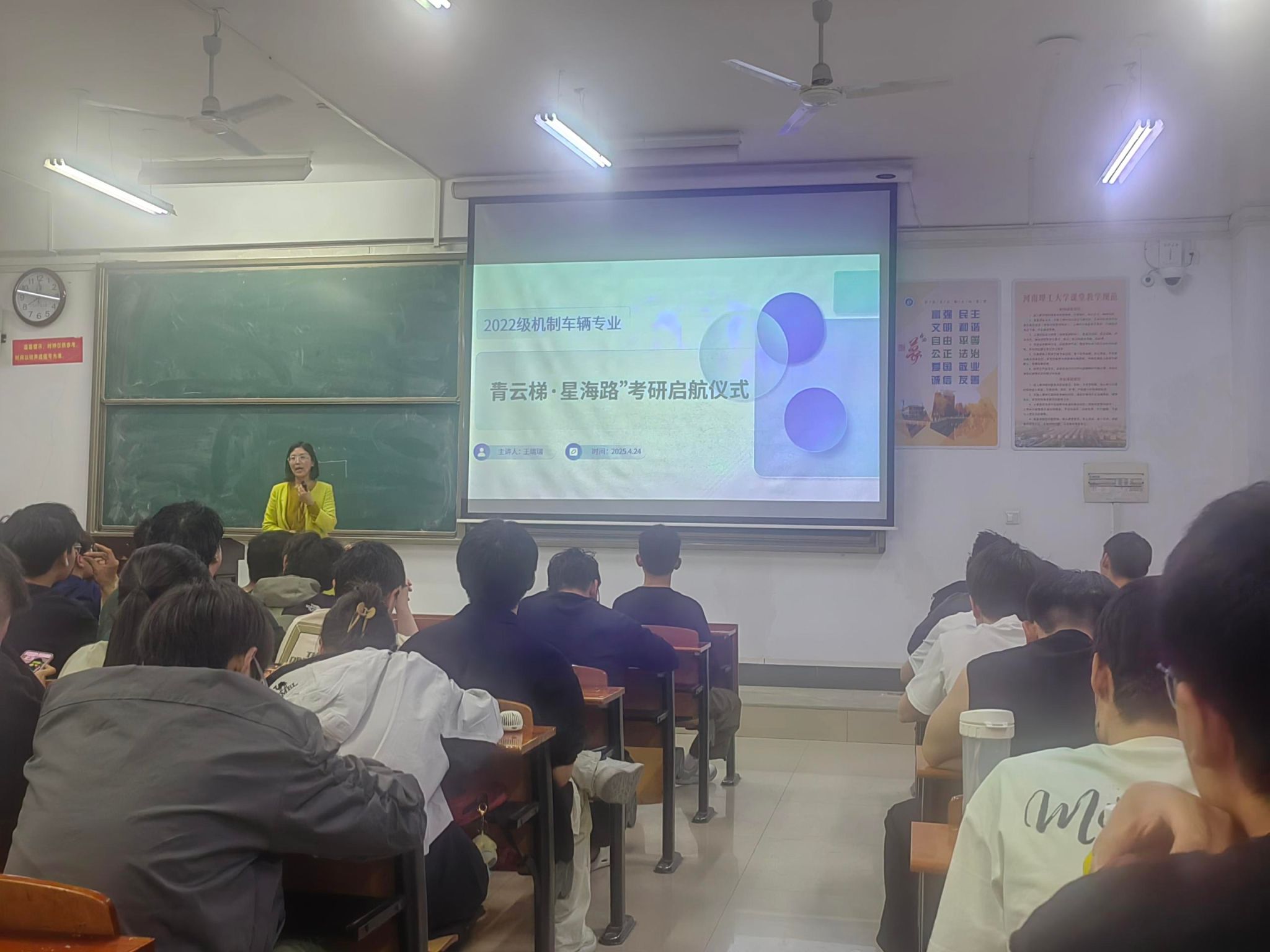 (本网讯 王瑞瑞 王文韬)4月24日晚,我院2022级机制车辆专业在三号教学楼以专业为单位举行“青云梯,星海路”考研启航仪式。两个专业300多名学生在辅导员老师的带领下,通过数据解读、政策研判、经验分享等环节,为备战2026年研究生考试绘制科学备考路线图。